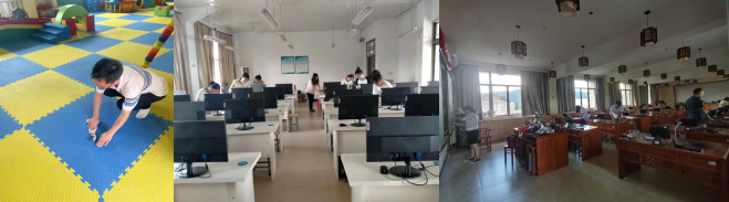 在已完成幼儿园虚拟仿真实训室、感统实训室和玩教具设计与制作实训室建设,更新了机房之际,为了下学期初学生到校各实训室就能正常使用,全体教师分成五个组,由党员教师或专业主任担任组长,大家自备工具(铲子、抹布、清洁剂等),投入到热火朝天的劳动当中。抽屉、角落旮旯,甚至电脑桌上鼠标垫的粘连物,进行全方位、无一死角的清理。最难的是玩教具设计与制作实训室装修后手工作品展的高柜归位,四位平时看上去很斯文的党员男教师,喊着整齐的号子,齐心协力将四大高柜妥妥的归位,衣服湿了干,干了又湿,大家从没叫一声累。