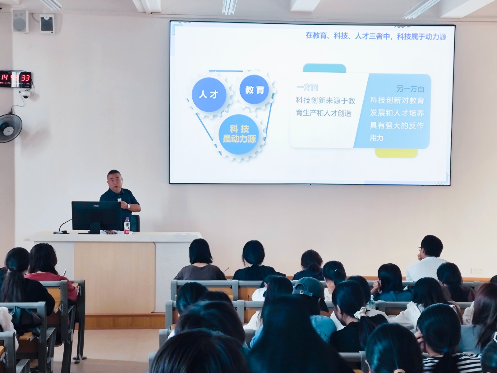 张完英则引入我国科技事业取得的历史性成就和变革,并结合学生专业实际,从“着眼长远发展的重大抉择”、“铸就强国建设的坚实基础”、“加快强国建设的战略部署”、“充分发挥高校的重要作用”等四个方面展开,阐明了人才是国家长远发展的最重要支撑力量。她强调,身为教育系学子,需要扎实理论基础,不断提升专业水平,才能更好的成长为对党和国家教育事业发展有用之才。