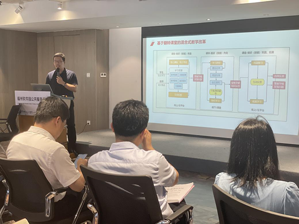 本次研讨会主题是研讨如何将校企共建的软件产业学院办出特色,会议上安博科技黄凯宏总经理作为企业方率先发言,从“互联网+”环境的发展趋势、各行各业软件人才需求等方面,阐述了校企合作、产教融合培养软件技术人才必要性。福州软件园管委会谢在秀副主任介绍了福州软件园的园区情况,并提出校企合作与园区生态合作的可能性。随后产业学院专业带头人杨斌介绍了软件产业学院人才培养及建设发展规划、安博科技项目经理刘燕江介绍“我的大学云”系列数字教育产品。
