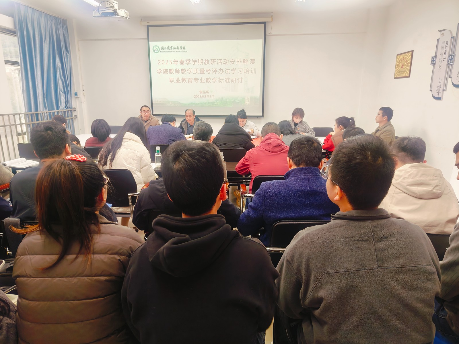 2024年3月5日,食品系组织“学院教师教学质量考评办法学习培训、2025年春季学期教研活动安排解读、职业教育专业教学标准研讨”,系全体教职工参加。会议前两个阶段,由系教科办主持,对照《闽北职业技术学院教师教学质量考评办法》和《关于开展2025年春季学期教研活动通知》,进行了详细的解读和学习,最后按专业群,开展职业教育专业教学标准研讨。通过本次教研活动,全系教职工对学院教师教学质量考评办法和学院2025年春季学期教研活动安排有了清楚的认识,各专业对新的职业教育专业教学标准理解进一步加深,对制定2025年各专业人才培养方案提供了有力的支持。