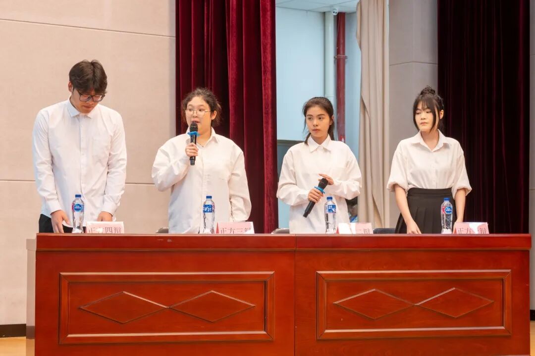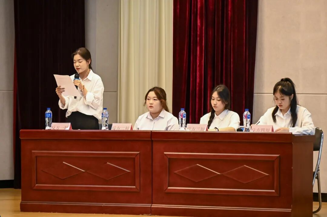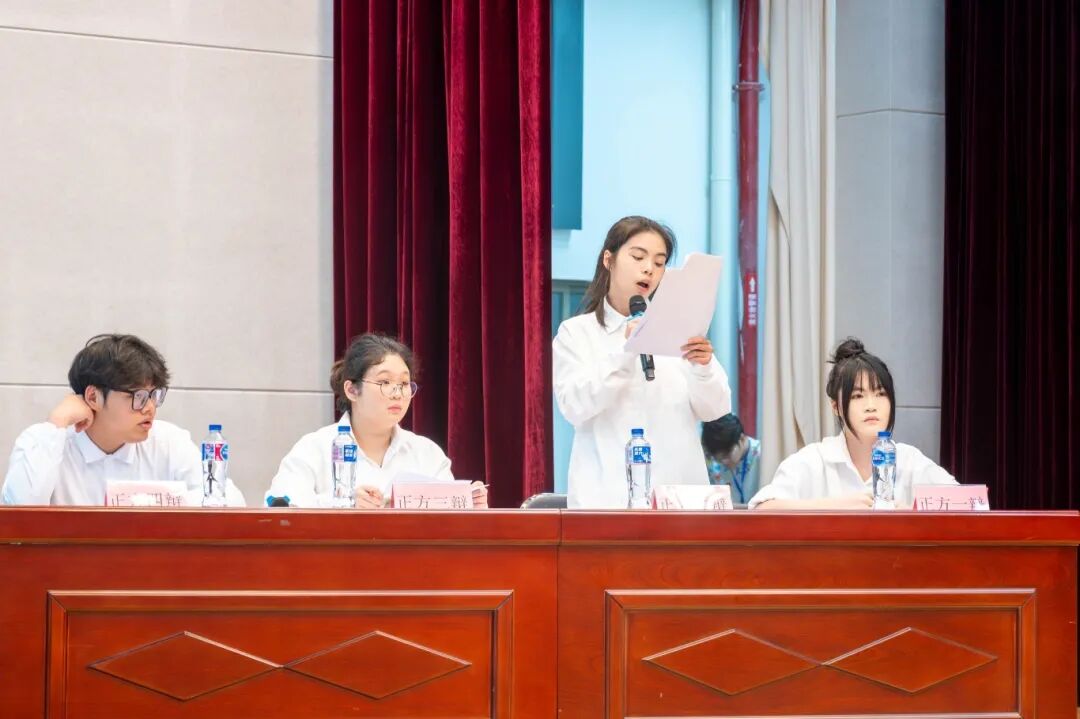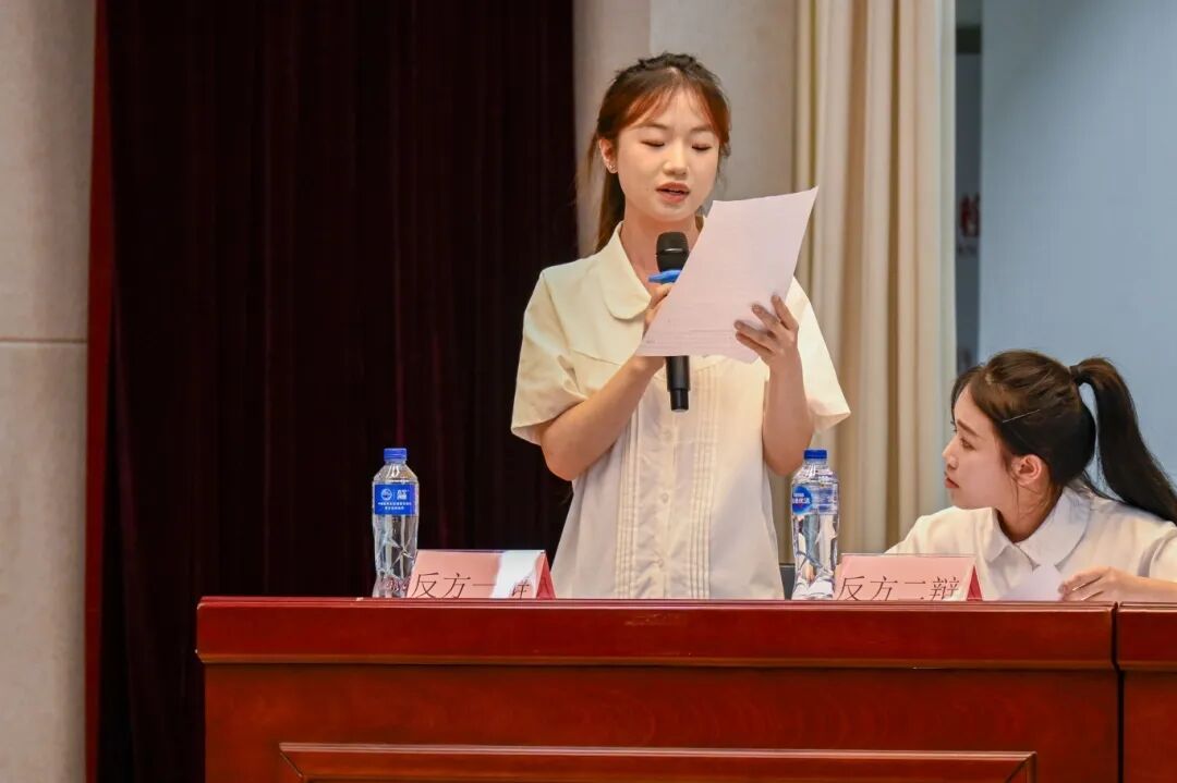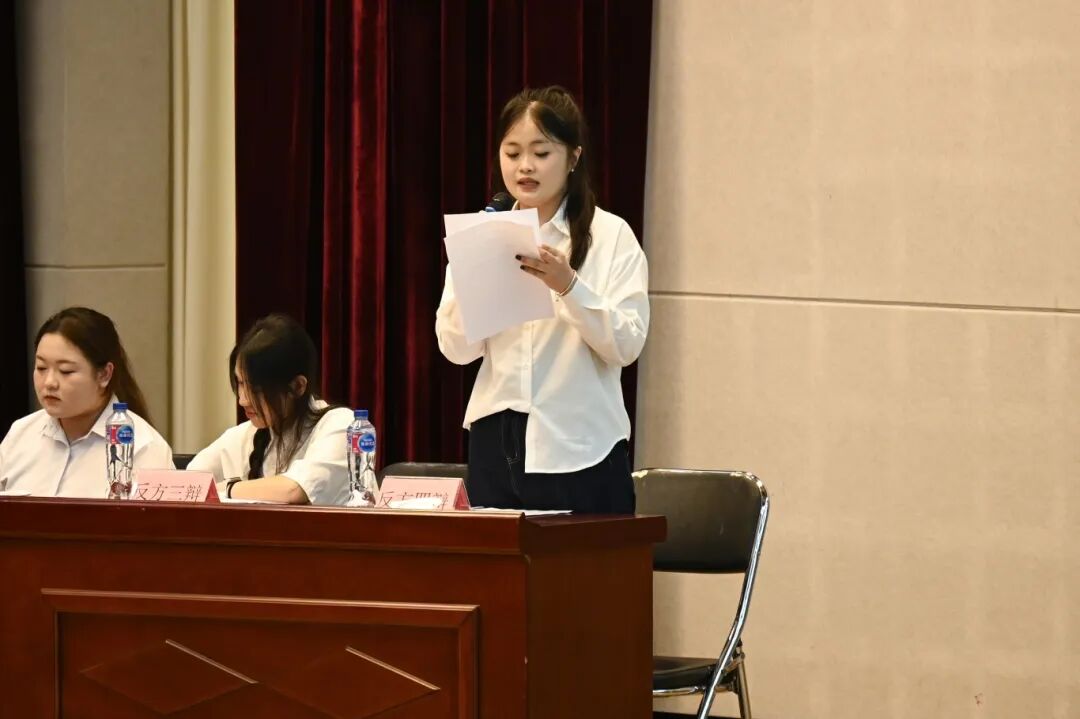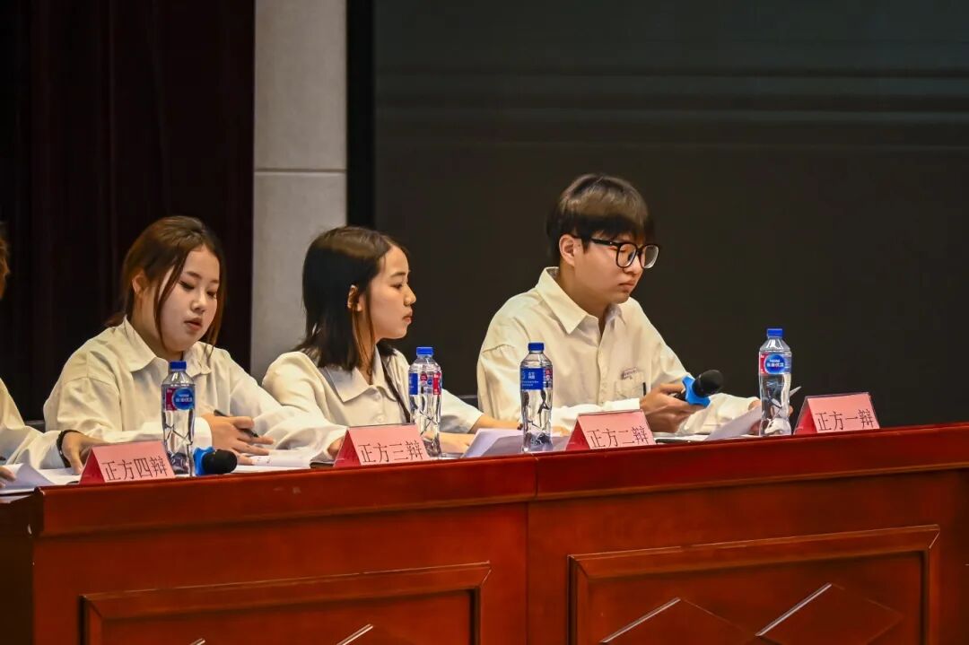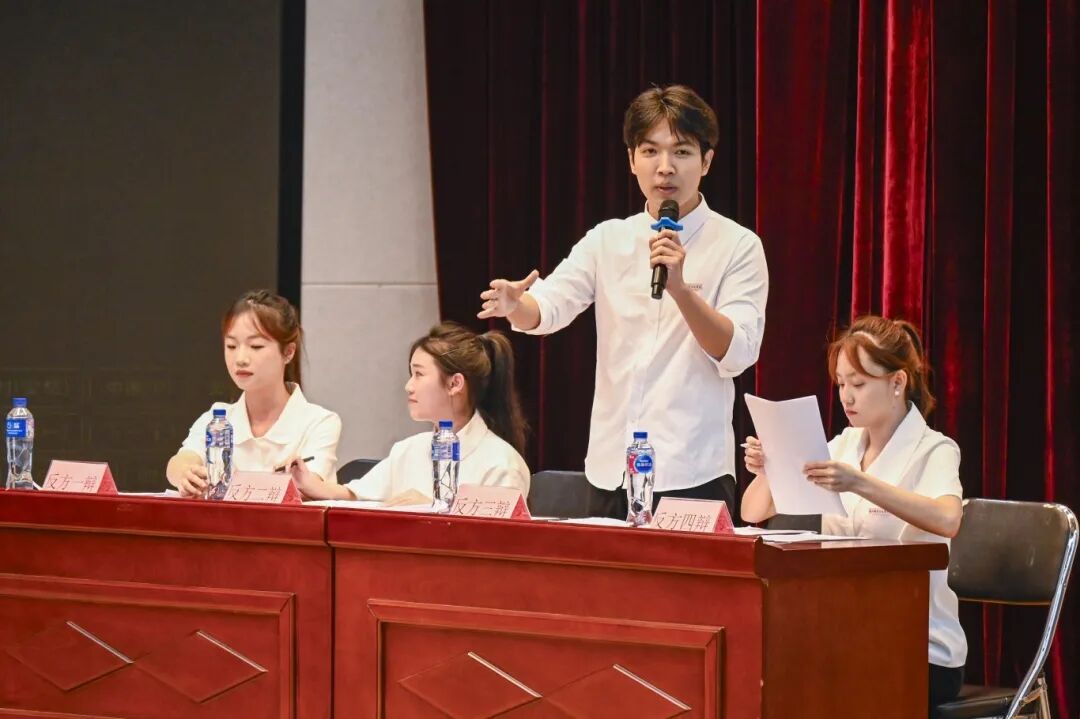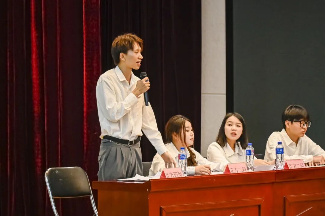 第二场较量中,食品系代表队与设管系代表队就“相亲与一见钟情哪个更利于婚姻幸福”展开辩论。双方辩手旁征博引,从社会现象深入到理论依据,层层剖析,将现场气氛推向高潮。赛场上,双方你来我往,妙语连珠,围绕辩题展开激烈的思想碰撞。选手们各展才华、智慧与团队精神,为观众呈现了一场精彩绝伦的视听盛宴。最后,陈震熹老师对这场辩论赛进行了精彩点评。