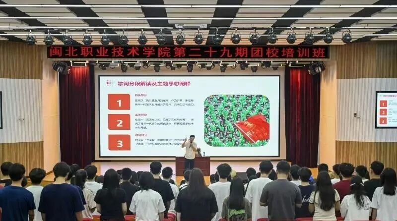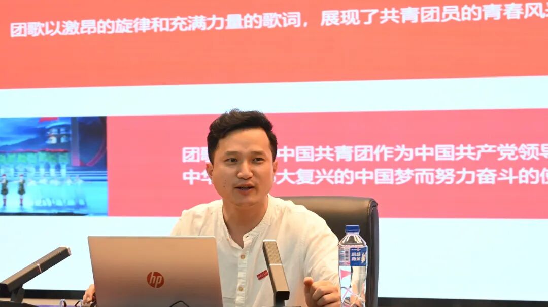 院团委综合科科长黄旭老师从《团歌》的创作背景、词曲创作者的故事和歌曲逐步修改完善的历史等方面入手,为全体学员上了一堂音乐思政团课,在教唱团歌中进一步坚定了学员们加入共青团组织的信念。