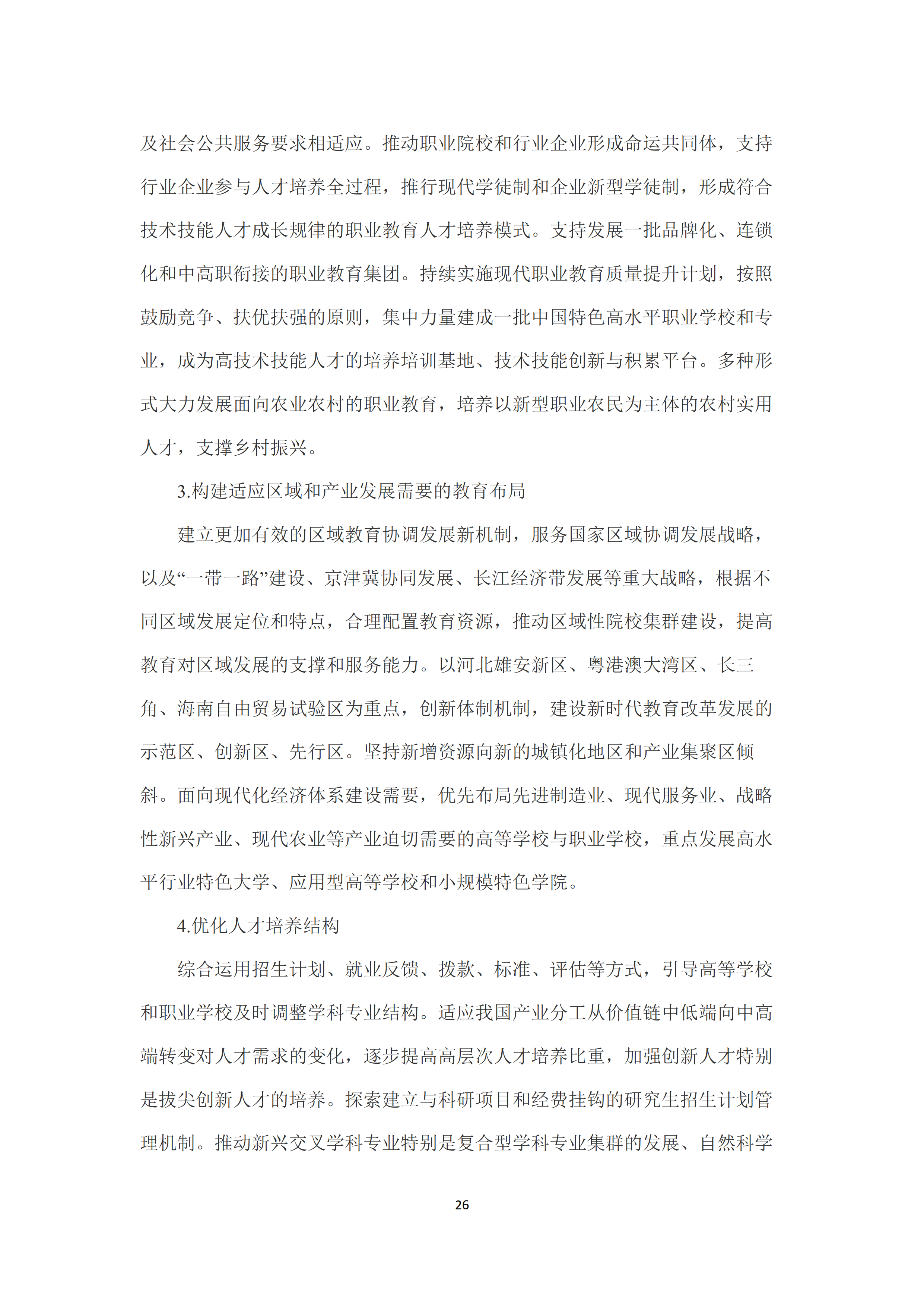 六是提升一流人才培养与创新能力。分类建设一批世界一流高等学校,建立完善的高等学校分类发展政策体系,引导高等学校科学定位、特色发展。持续推动地方本科高等学校转型发展。加快发展现代职业教育,不断优化职业教育结构与布局。推动职业教育与产业发展有机衔接、深度融合,集中力量建成一批中国特色高水平职业院校和专业。优化人才培养结构,综合运用招生计划、就业反馈、拨款、标准、评估等方式,引导高等学校和职业学校及时调整学科专业结构。加强创新人才特别是拔尖创新人才的培养,加大应用型、复合型、技术技能型人才培养比重。加强高等学校创新体系建设,建设一批国际一流的国家科技创新基地,加强应用基础研究,全面提升高等学校原始创新能力。探索构建产学研用深度融合的全链条、网络化、开放式协同创新联盟。提高高等学校哲学社会科学研究水平,加强中国特色新型智库建设。健全有利于激发创新活力和促进科技成果转化的科研体制。