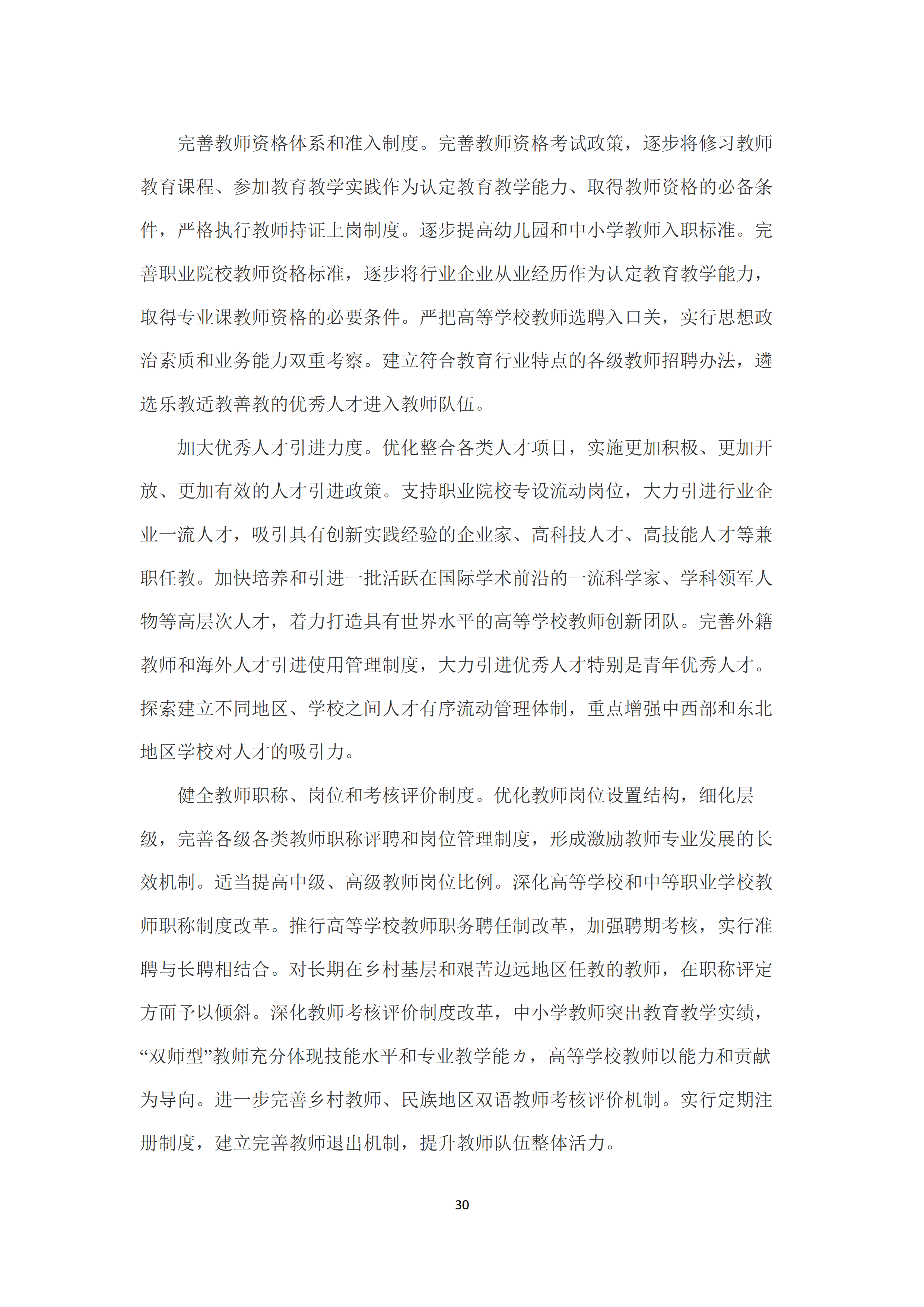 七是建设高素质专业化创新型教师队伍。大力加强师德师风建设,将师德师风作为评价教师素质的第一标准,推动师德建设长效化、制度化。加大教职工统筹配置和跨区域调整力度,切实解决教师结构性、阶段性、区域性短缺问题。完善教师资格体系和准入制度。健全教师职称、岗位和考核评价制度。培养高素质教师队伍,健全以师范院校为主体、高水平非师范院校参与、优质中小学(幼儿园)为实践基地的开放、协同、联动的中国特色教师教育体系。强化职前教师培养和职后教师发展的有机衔接。夯实教师专业发展体系,推动教师终身学习和专业自主发展。提高教师社会地位,完善教师待遇保障制度,健全中小学教师工资长效联动机制,全面落实集中连片特困地区生活补助政策。加大教师表彰力度,努力提高教师政治地位、社会地位、职业地位。
