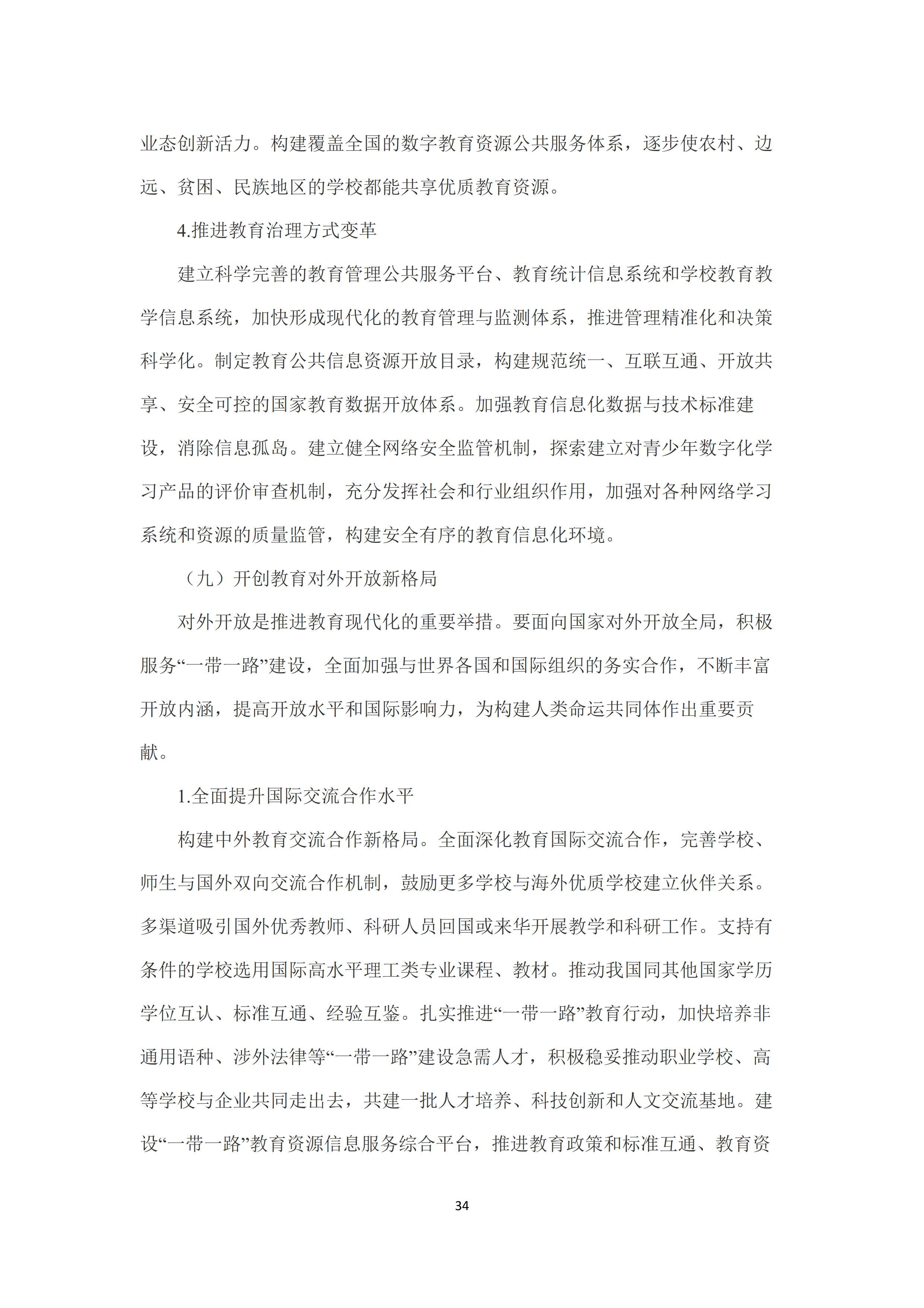 八是加快信息化时代教育变革。建设智能化校园,统筹建设一体化智能化教学、管理与服务平台。利用现代技术加快推动人才培养模式改革,实现规模化教育与个性化培养的有机结合。创新教育服务业态,建立数字教育资源共建共享机制,完善利益分配机制、知识产权保护制度和新型教育服务监管制度。推进教育治理方式变革,加快形成现代化的教育管理与监测体系,推进管理精准化和决策科学化。