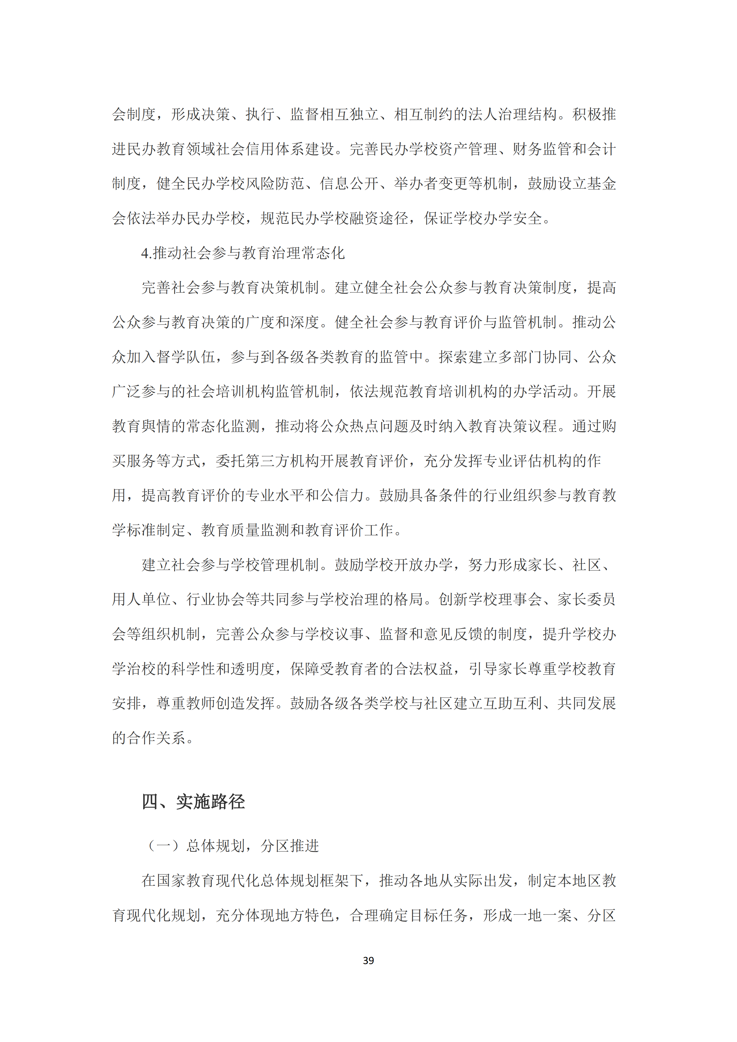 十是推进教育治理体系和治理能力现代化。提高教育法治化水平,构建完备的教育法律法规体系,健全学校办学法律支持体系。健全教育法律实施和监管机制。提升政府管理服务水平,提升政府综合运用法律、标准、信息服务等现代治理手段的能力和水平。健全教育督导体制机制,提高教育督导的权威性和实效性。提高学校自主管理能力,完善学校治理结构,继续加强高等学校章程建设。鼓励民办学校按照非营利性和营利性两种组织属性开展现代学校制度改革创新。推动社会参与教育治理常态化,建立健全社会参与学校管理和教育评价监管机制。